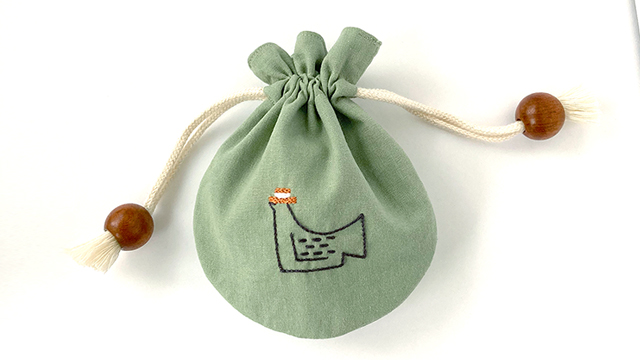 手刺繍で描かれたニワトリを抱える女性のモチーフが印象的。遊び心あふれるデザインが、見るたびに笑顔を誘います。