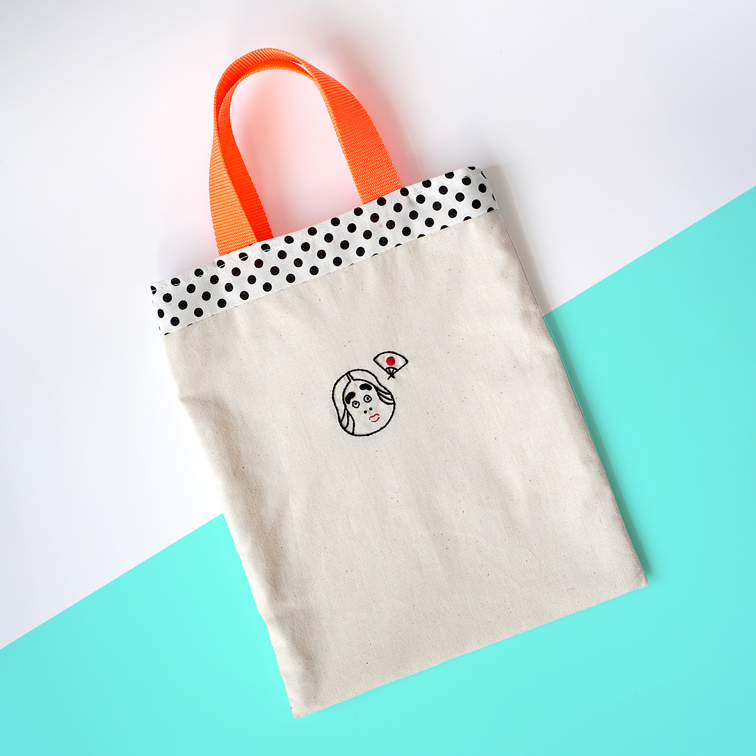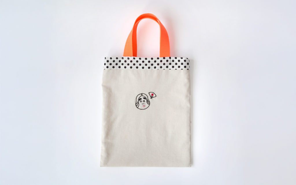 にっこり笑顔のおたふくさんがほっこり刺繍された、B5サイズのフラットバッグ。持ち歩くだけで縁起がいいような、明るい気持ちにしてくれる一枚です。