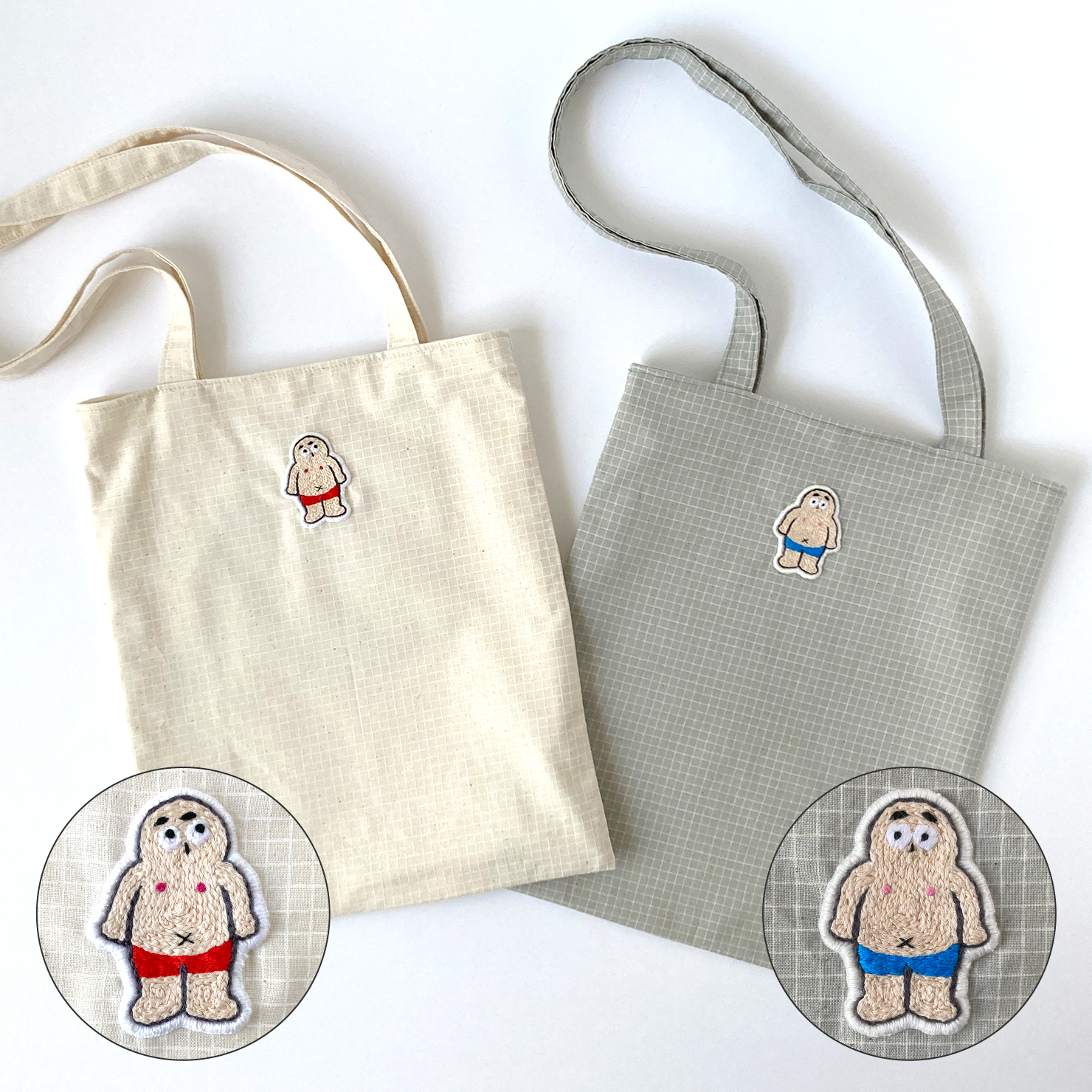 ちょっと真面目で、どこかおちゃめな表情のおじさん。見つめればつい“今日もがんばろう”と思わせてくれる、癒し系刺繍バッグです。
