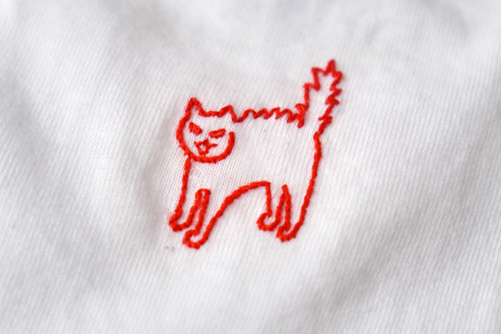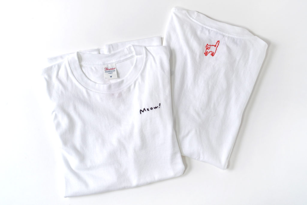 胸元には小さく『Meow!』、背中には“やんのかニャンコ”の手刺繍入り。前も後ろも抜かりない、遊び心あふれる一枚です。小さなワンポイントなのに、配色とポーズでしっかり主張。手刺繍ならではの風合いと“ニャんのか感”がクセになる仕上がりです。