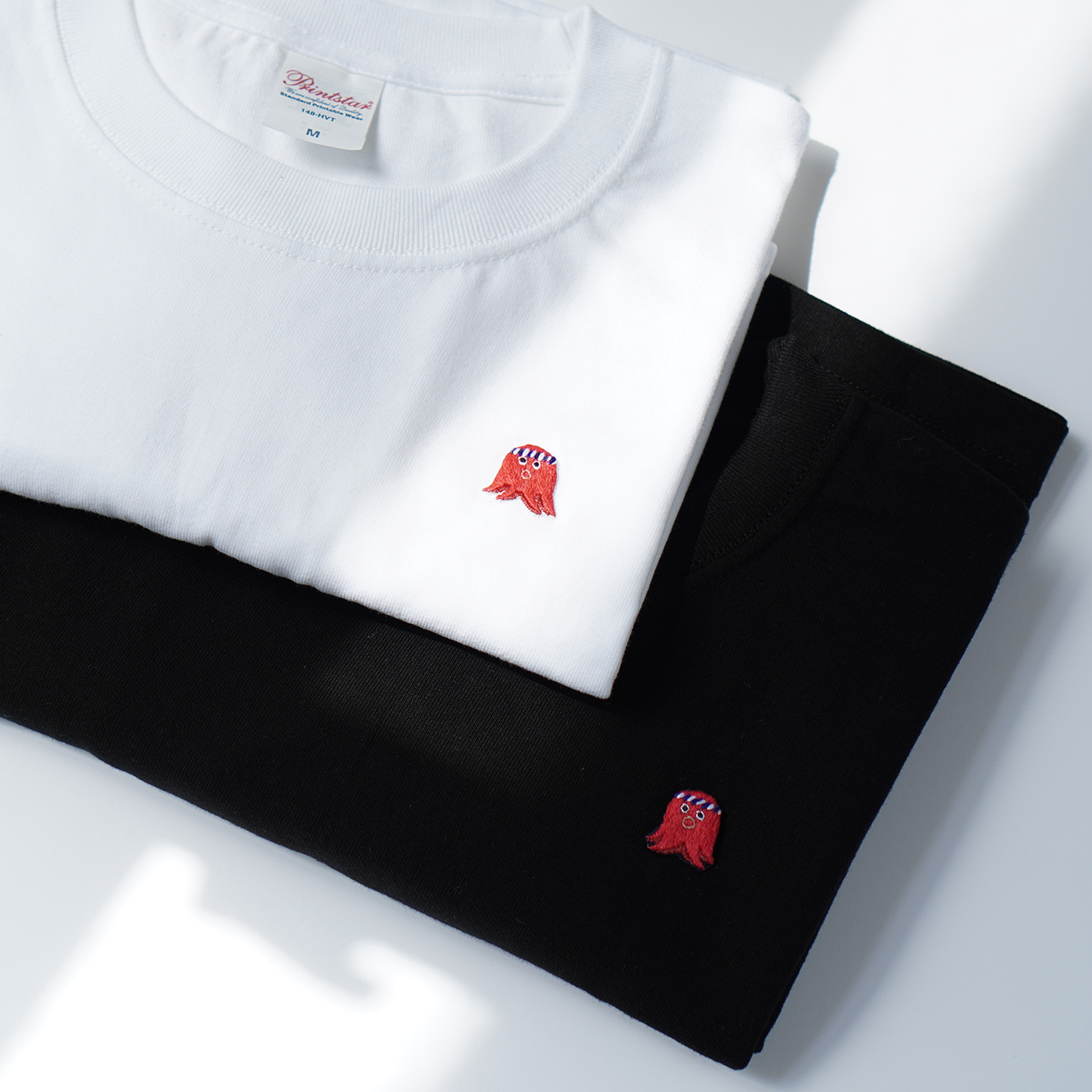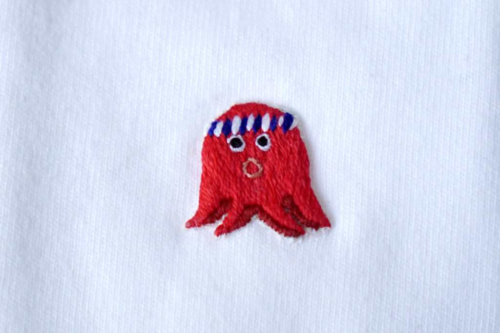 ねじり鉢巻きをしたキュートなたこさんが鎮座する、手刺繍Tシャツ。夏祭りの気分をそっと背負って出かけたくなる一枚。