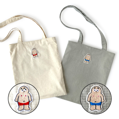 困り顔の“ふとっちょおじさん”がアクセント。シンプルコーデにも遊び心を添える、A4サイズ対応の手刺繍トートバッグ。