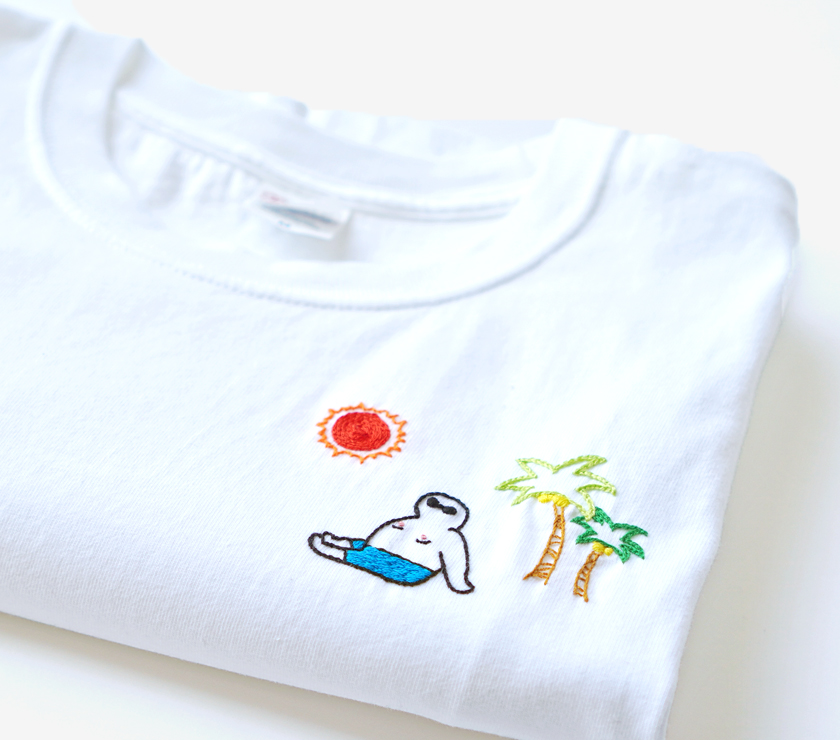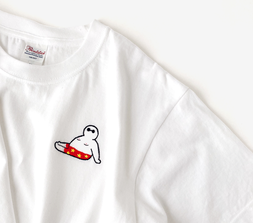 “ふとっちょおじさん”に加えて太陽やヤシの木を手刺繍。夏らしくポップなデザインながら、7.4オンスのヘビーウェイト生地で首周りもヨレにくく丈夫。程よい柔らかさで着心地も快適です。