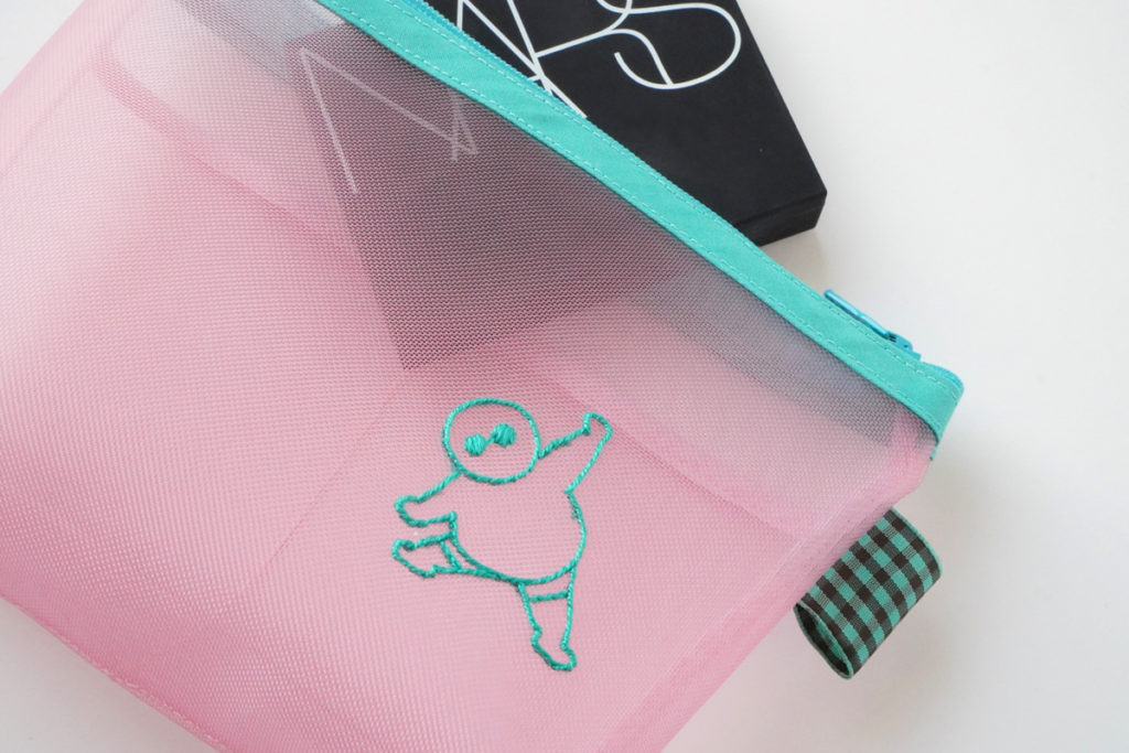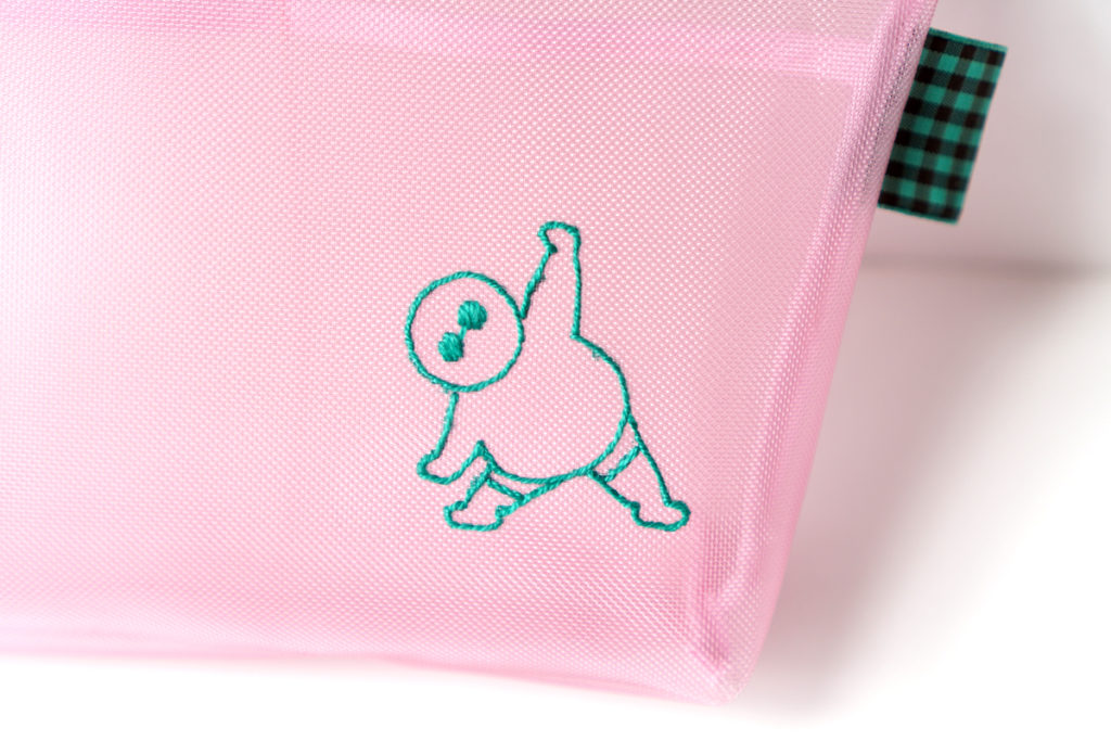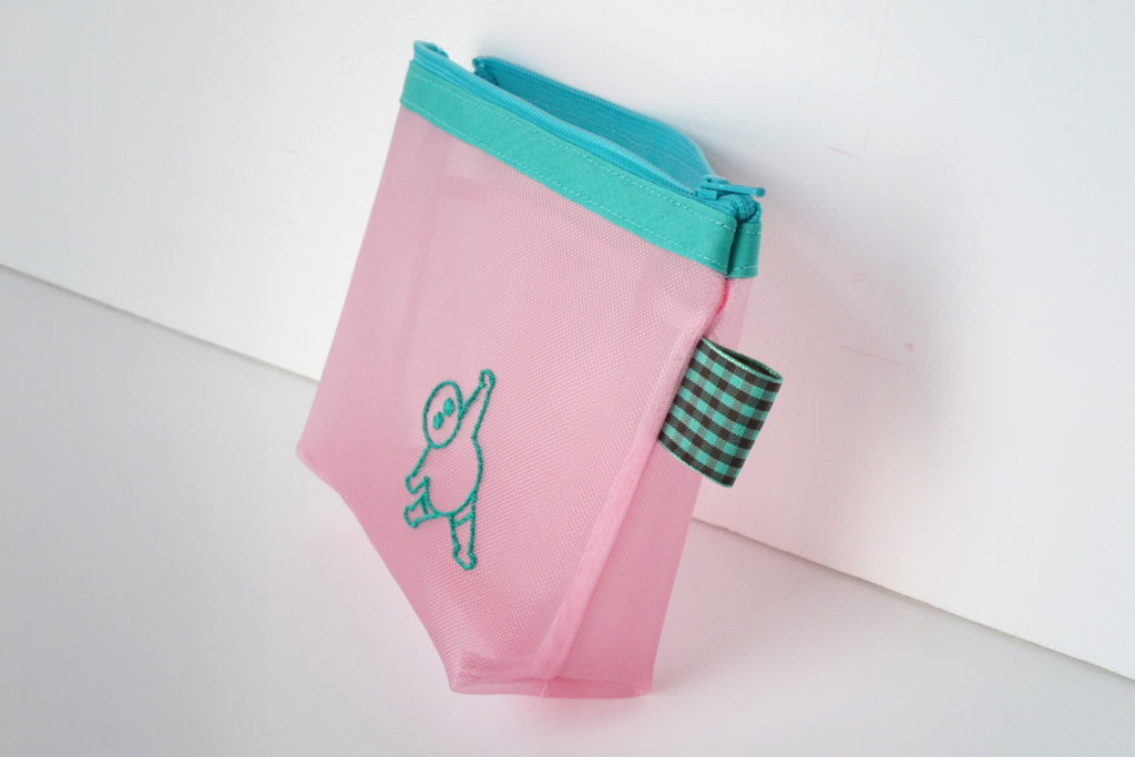 ピンクのメッシュ地にエメラルドグリーンのファスナーがアクセント。愛嬌たっぷりの“ふとっちょおじさん”の手刺繍が映える、見た目も気分もポップなデザインです。