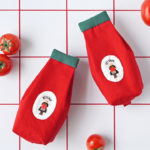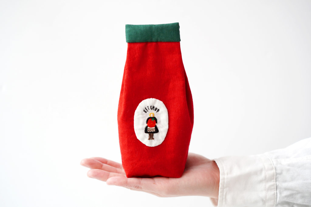手刺繍で描かれたトマトを抱える女性のモチーフが印象的。遊び心あふれるデザインが、見るたびに笑顔を誘います。